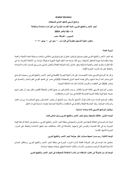This interdisciplinary IOI training programme focuses on regional ocean governance in the Red Sea and Arabian Gulf. The four-week residential program, offered by IOI in Egypt at the National Institute of Oceanography and Fisheries in November 2024, will explore the complexities and opportunities within this critical region.