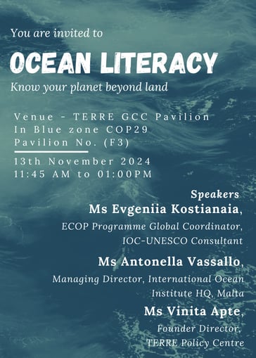 Operating under this premise, the IOI and TERRE Policy Centre - partners of the IOI in the IOI Ocean Academy Literacy programme in India - hosted a side event titled “Ocean Literacy: Know Your Planet Beyond Land” at the TERRE GCC Pavilion in Baku on the 13th November, during COP29. The event emphasised the importance of Ocean and Climate Literacy in empowering society at all levels with the knowledge and determination to tackle the urgent environmental challenges of our time.