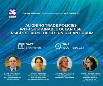 Following the 5th Ocean Forum, the IOI hosted a Continuing Professional Development (CPD) webinar titled "Aligning Trade Policies with Sustainable Ocean Use: Insights from the 5th UN Ocean Forum" on 27 March 2025. The webinar focused on the intersection of trade and ocean sustainability, examining how policies can better align with the principles of sustainable ocean governance and climate resilience. As part of the IOI’s commitment to fostering continued learning and engagement, the event offered IOI Alumni and ocean professionals valuable insights into the challenges and opportunities discussed at the forum. Watch the recording here.