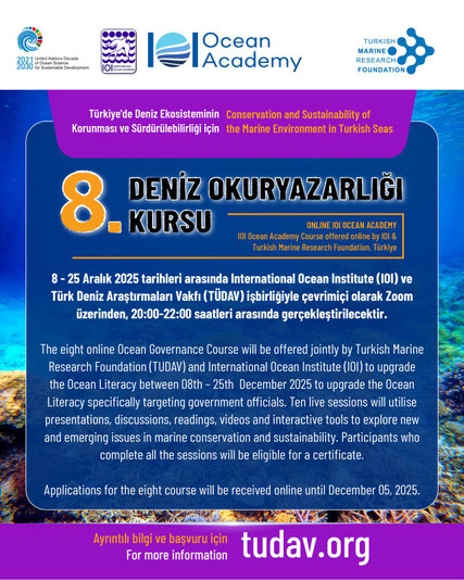 8-25 Aralik 2025 tarihleri arasında International Ocean Institute (IOI) ve Türk Deniz Araştırmaları Vakfı (TUDAV) işbirliğiyle çevrimiçi olarak Zoom üzerinden, 20:00-22:00 saatleri arasında gerçekleştirilecek olan kursa.