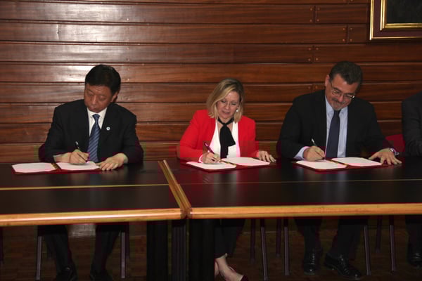 From left to right: Dr Awni Behnam and Mr Wang Hong signing the renewal of the MOU SOA-IOI; Mr Wang Hong, Ms Vassallo and Rector Camilleri signing the MOU between IOI, UOM and SOA