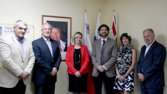 Present at IOI HQ were (L-R) Prof Louis Cassar, Director, Institute of Earth Systems; Prof Joseph M. Cacciottolo, Pro-Rector for Academic Affairs, University of Malta; Antonella Vassallo, Managing Director, IOI; Stefano Moncada; Kristina Edwards, Bursary awardee 2015-16; and Ben Rizzo, IOI.