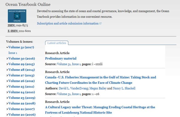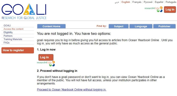 The Ocean Yearbook (current and past publications) is now available to readers in developing economy countries, as free or low-cost online access through the Research4Life programme GOALI (Global Online Access to Legal Information)