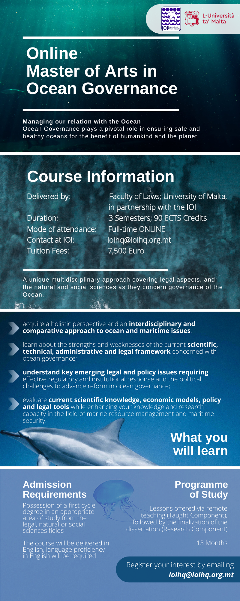 This Masters degree programme on Ocean Governance being offered by the University of Malta in collaboration with the International Ocean Institute is unique in its approach – it aims to forge a knowledge base that is essentially legal but which also delves into the natural and social sciences to determine how an effective regulatory framework should operate. The Master’s in Ocean Governance serves to further enhance the development of learning and research in the field of marine resource management and maritime security from a multidisciplinary perspective. In this era of globalization and sectoral integration, capacity building in the regulation of ocean governance plays a pivotal role in ensuring safe and healthy oceans for the benefit of humankind and the planet.